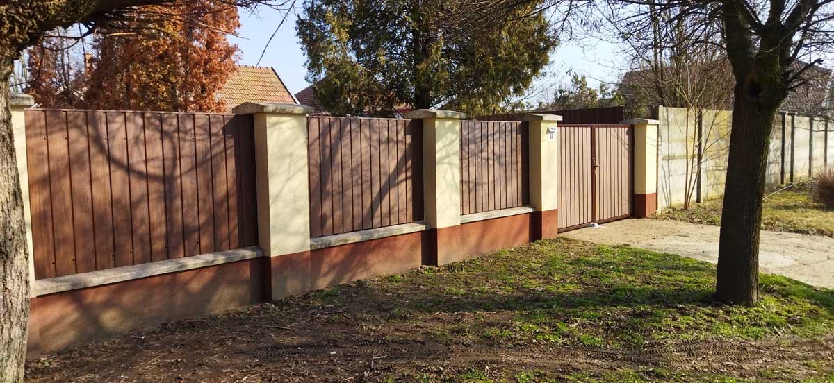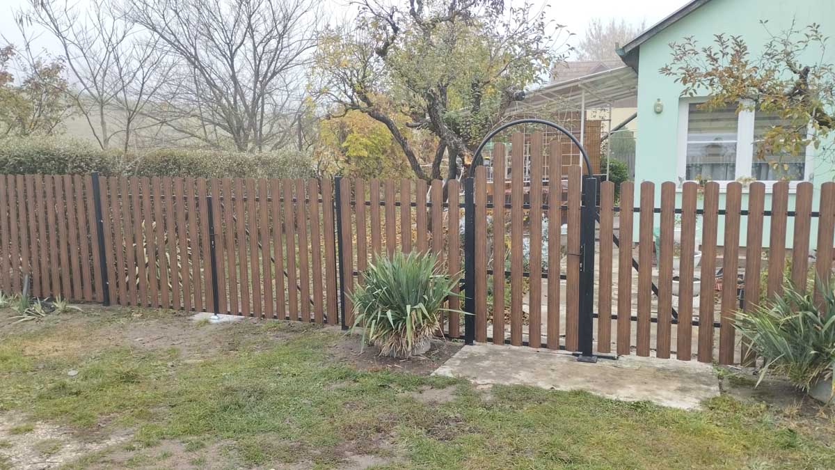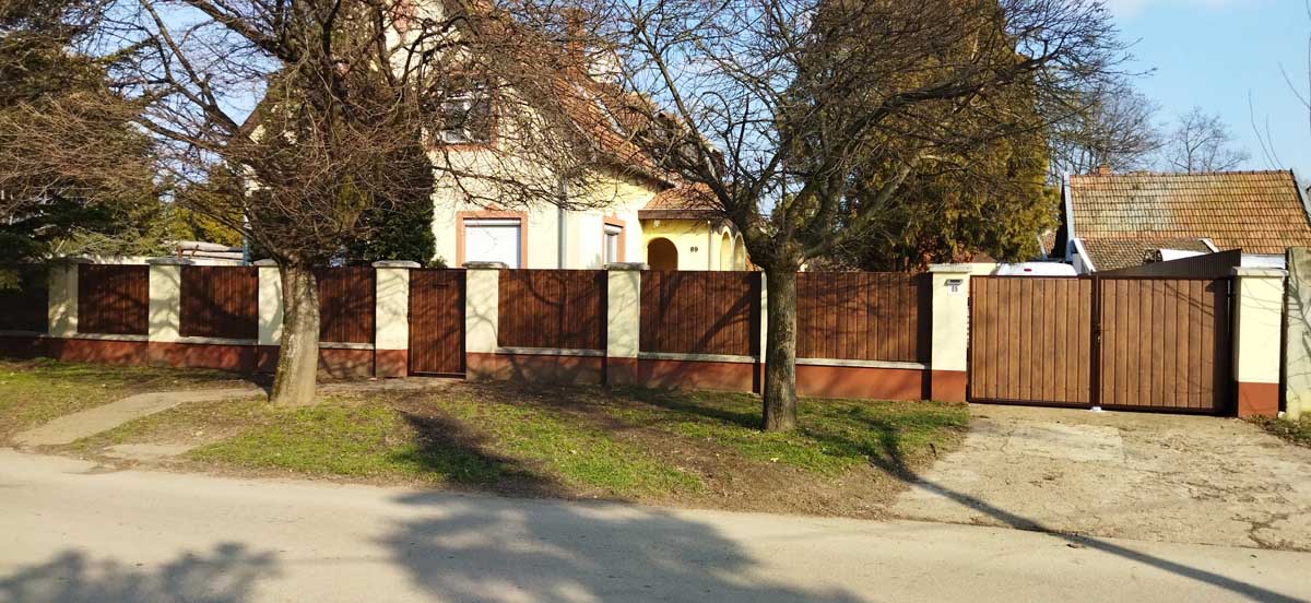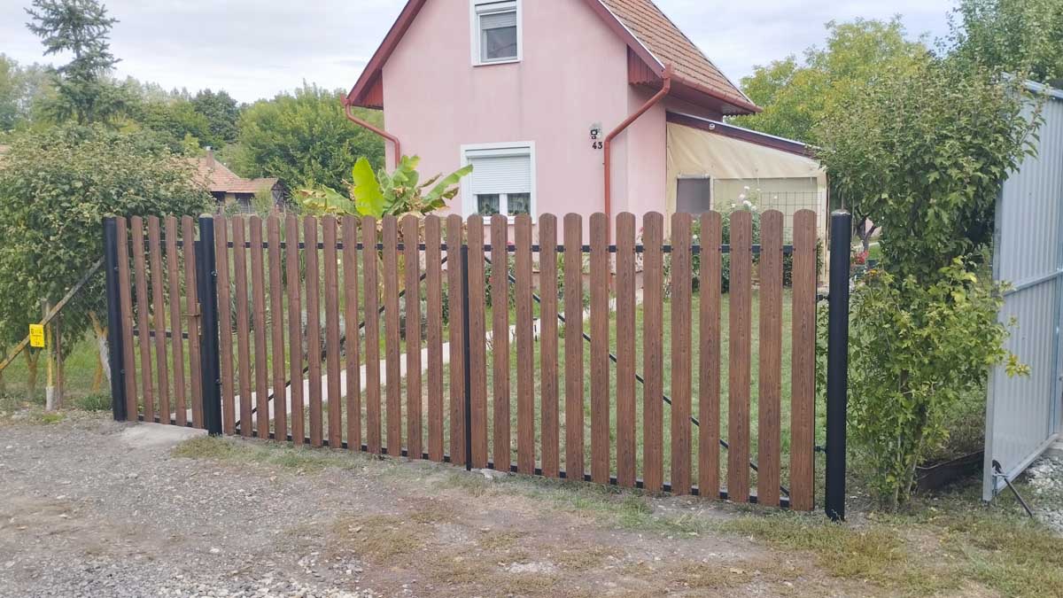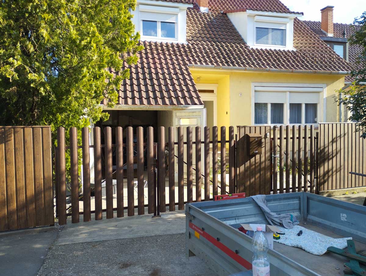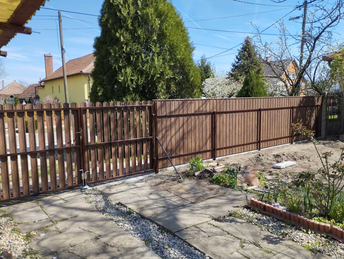 - Íves diófa mintás kerítés lécekkel a kapukon és trapéz lemez kerítéssel
