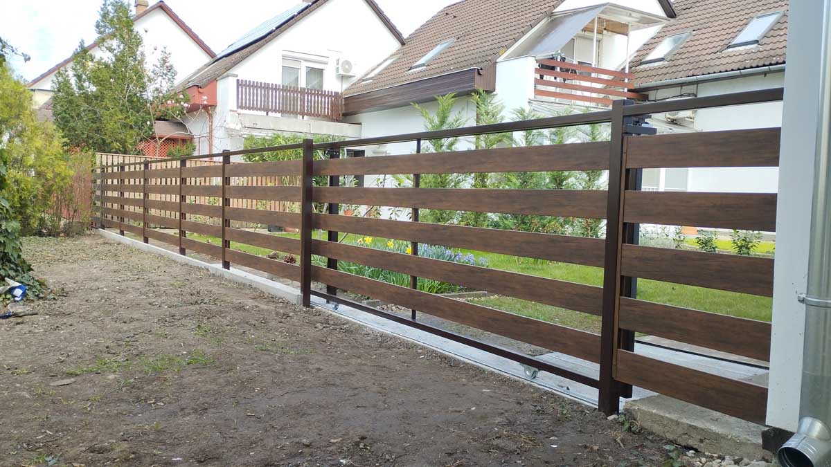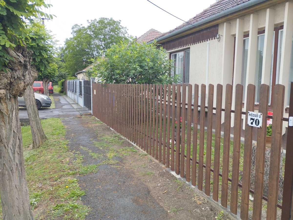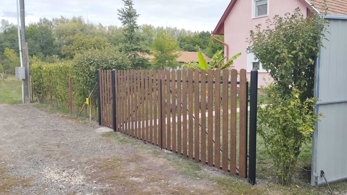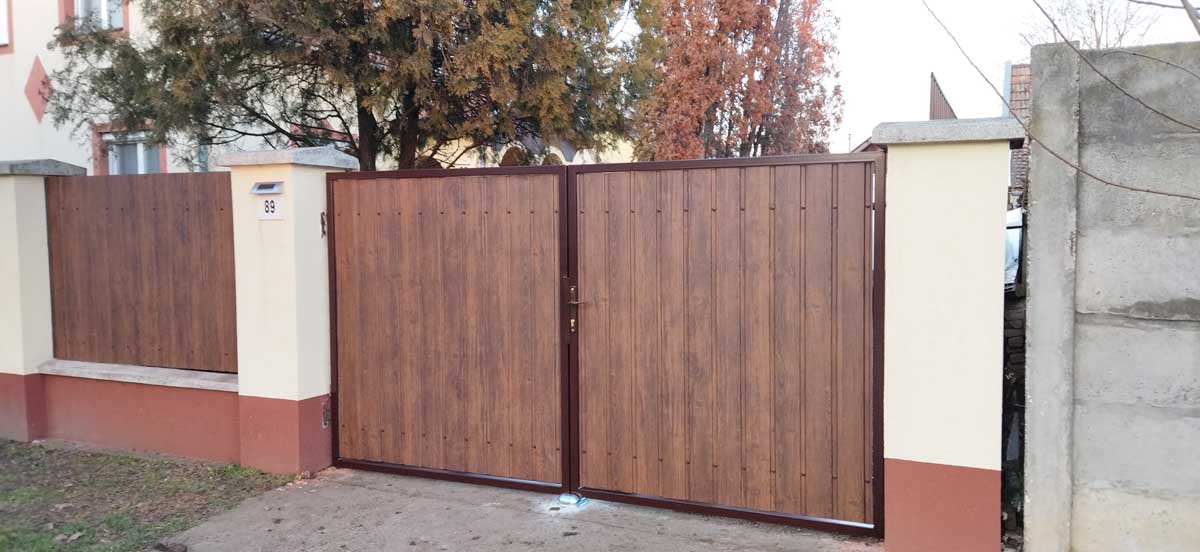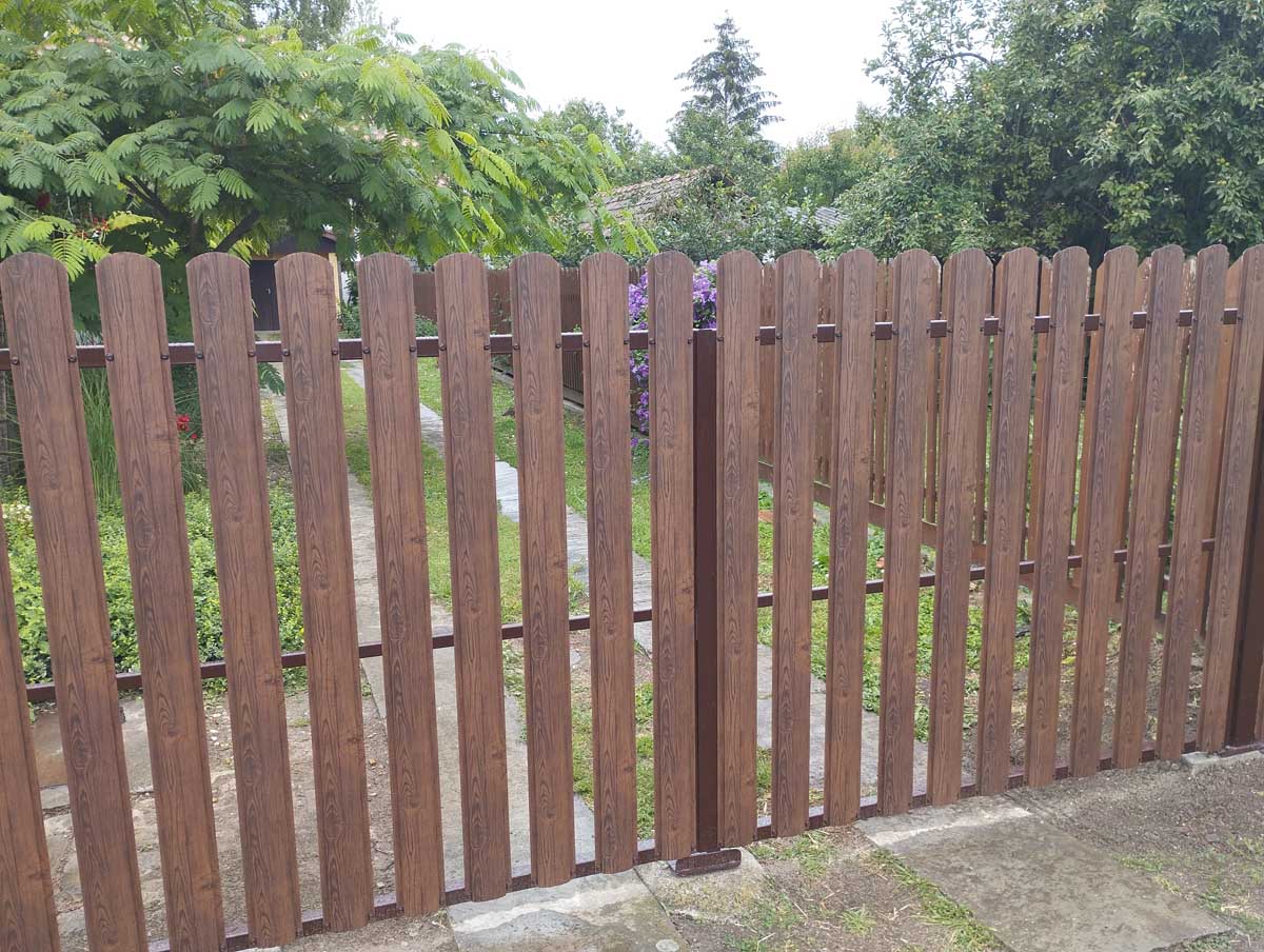 - Íves diófa mintás kerítés lécekkel a kapukon és trapéz lemez kerítéssel