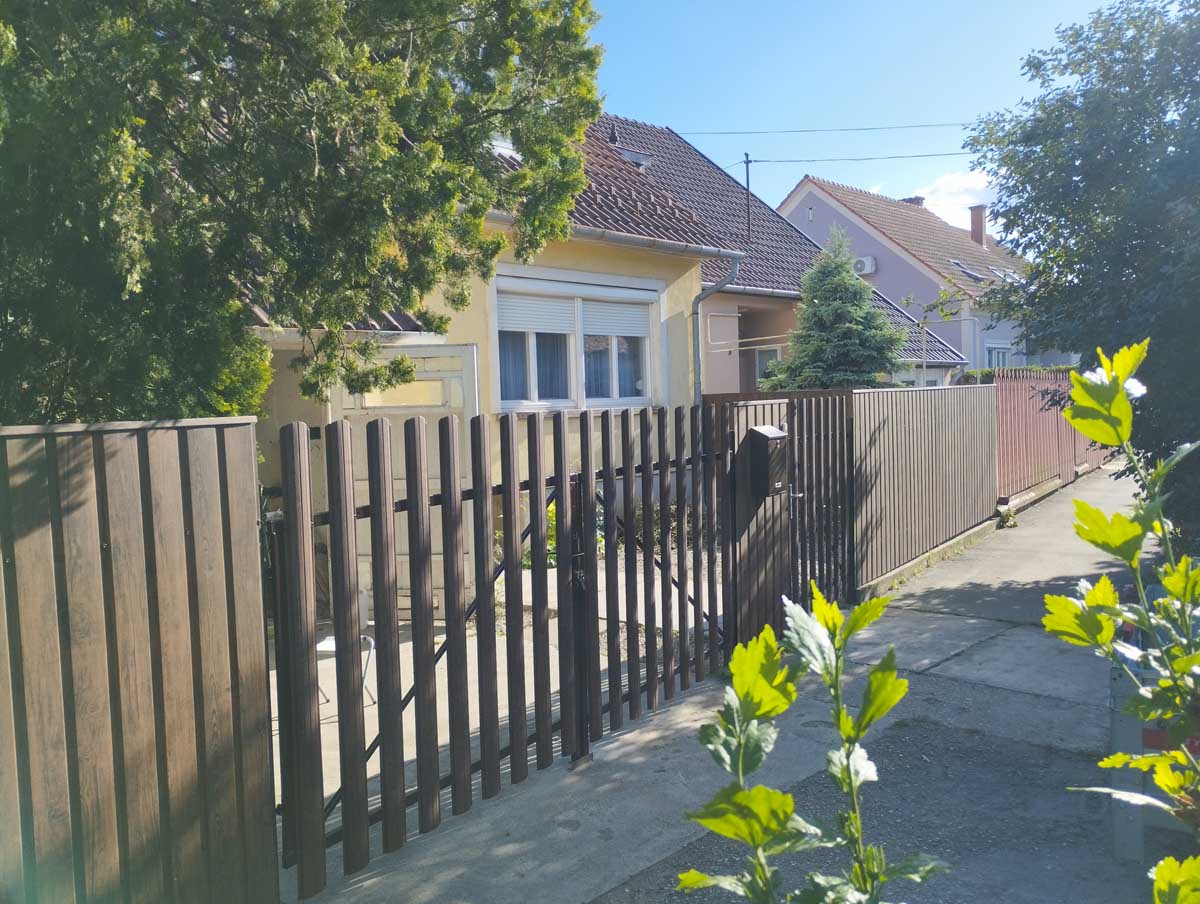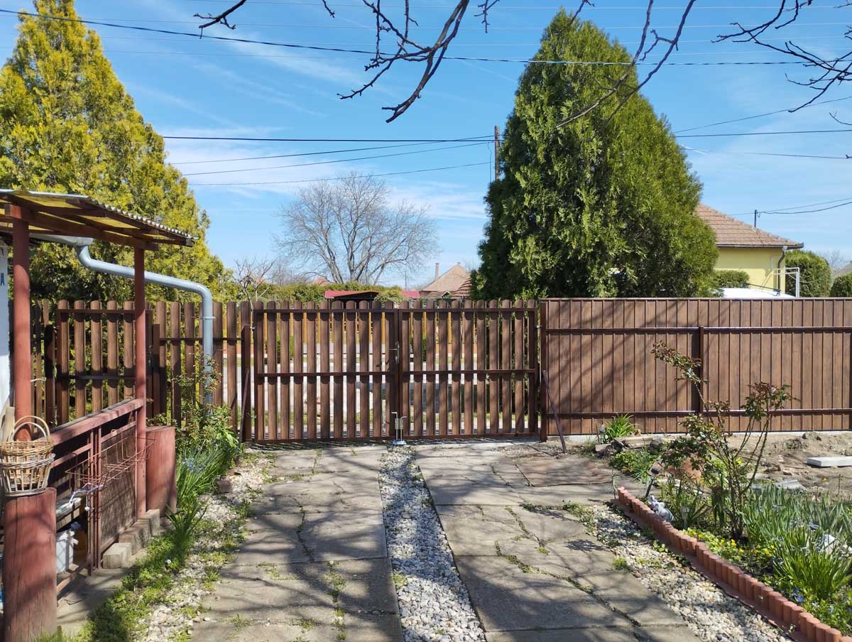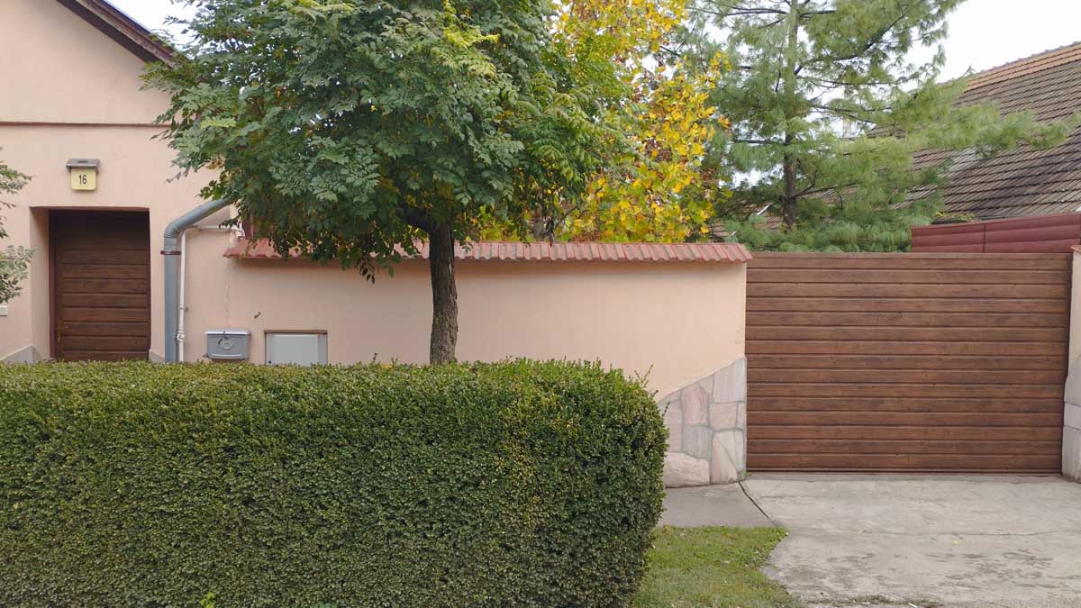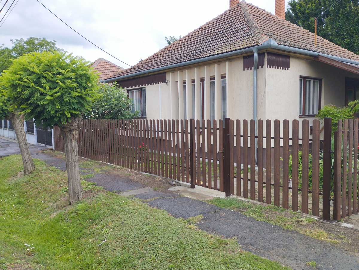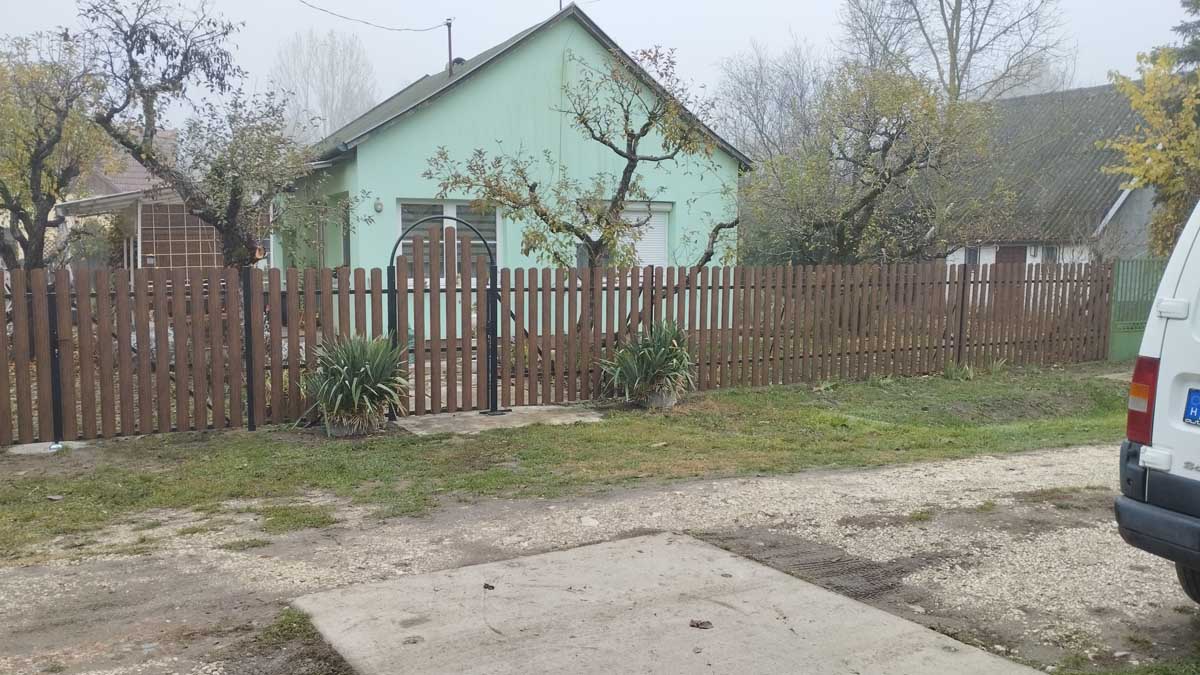 - Íves diófa mintás kerítés lécekkel a kapukon és trapéz lemez kerítéssel