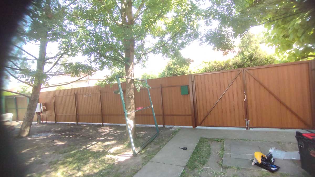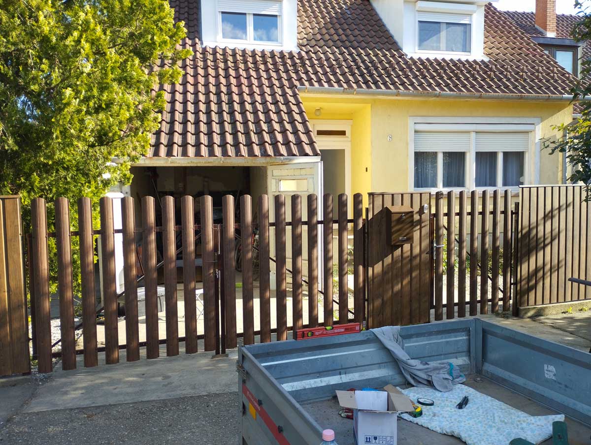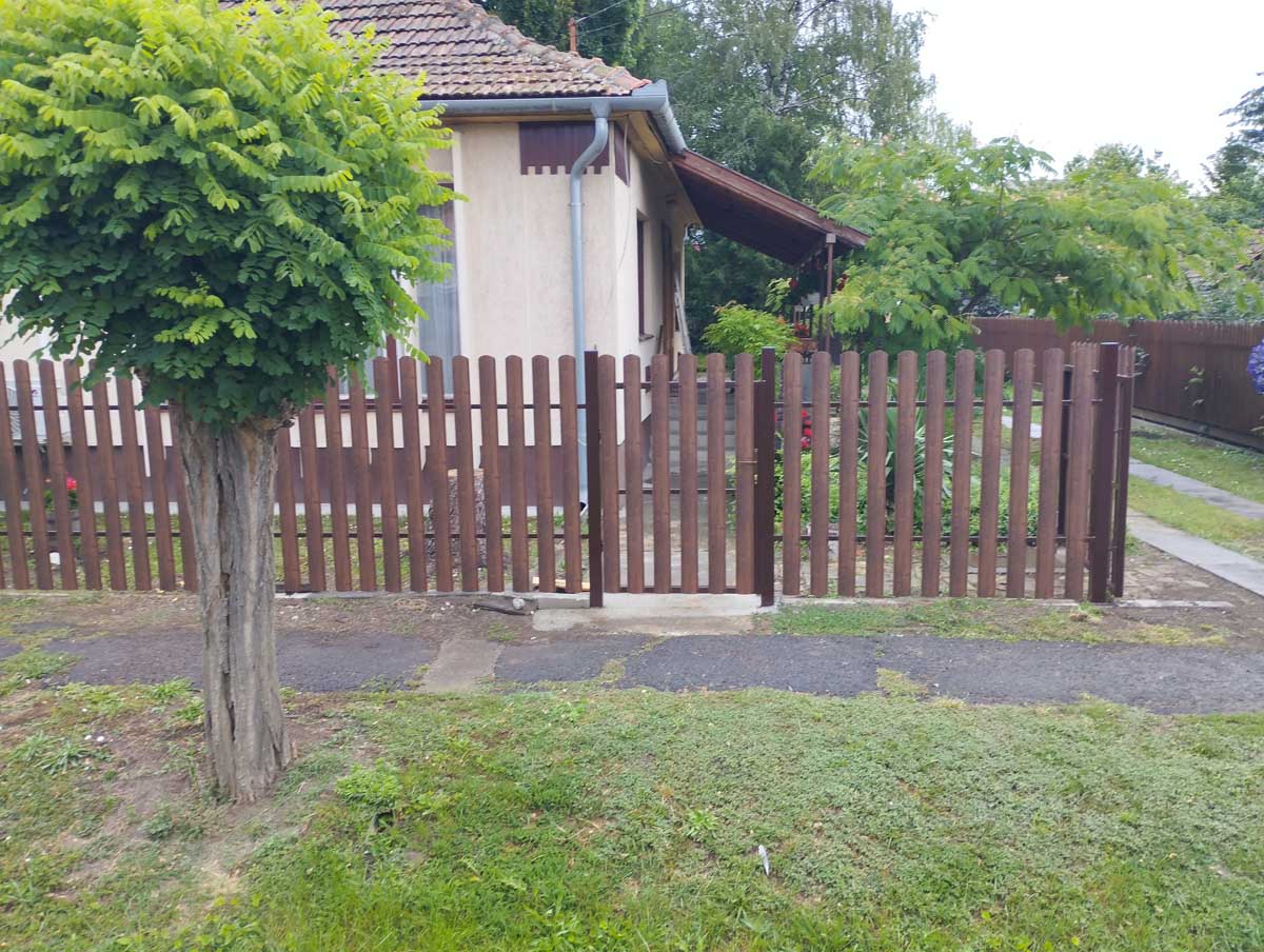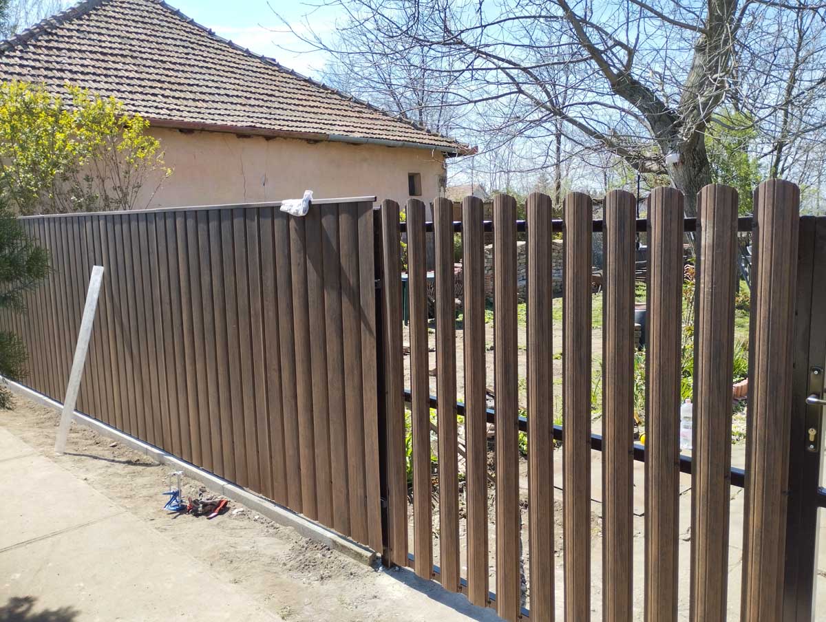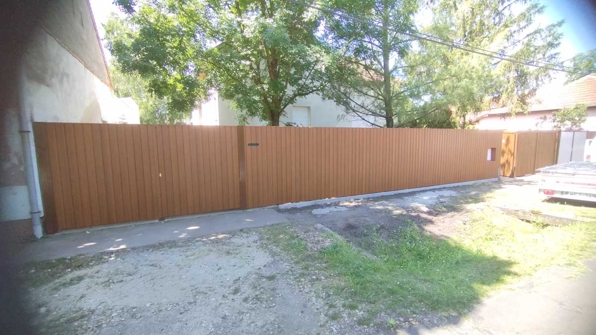 - T8-as diófamintás trapézlemez fedéssel meglévő kerítés elemek felújítása, új kiskapu gyártása