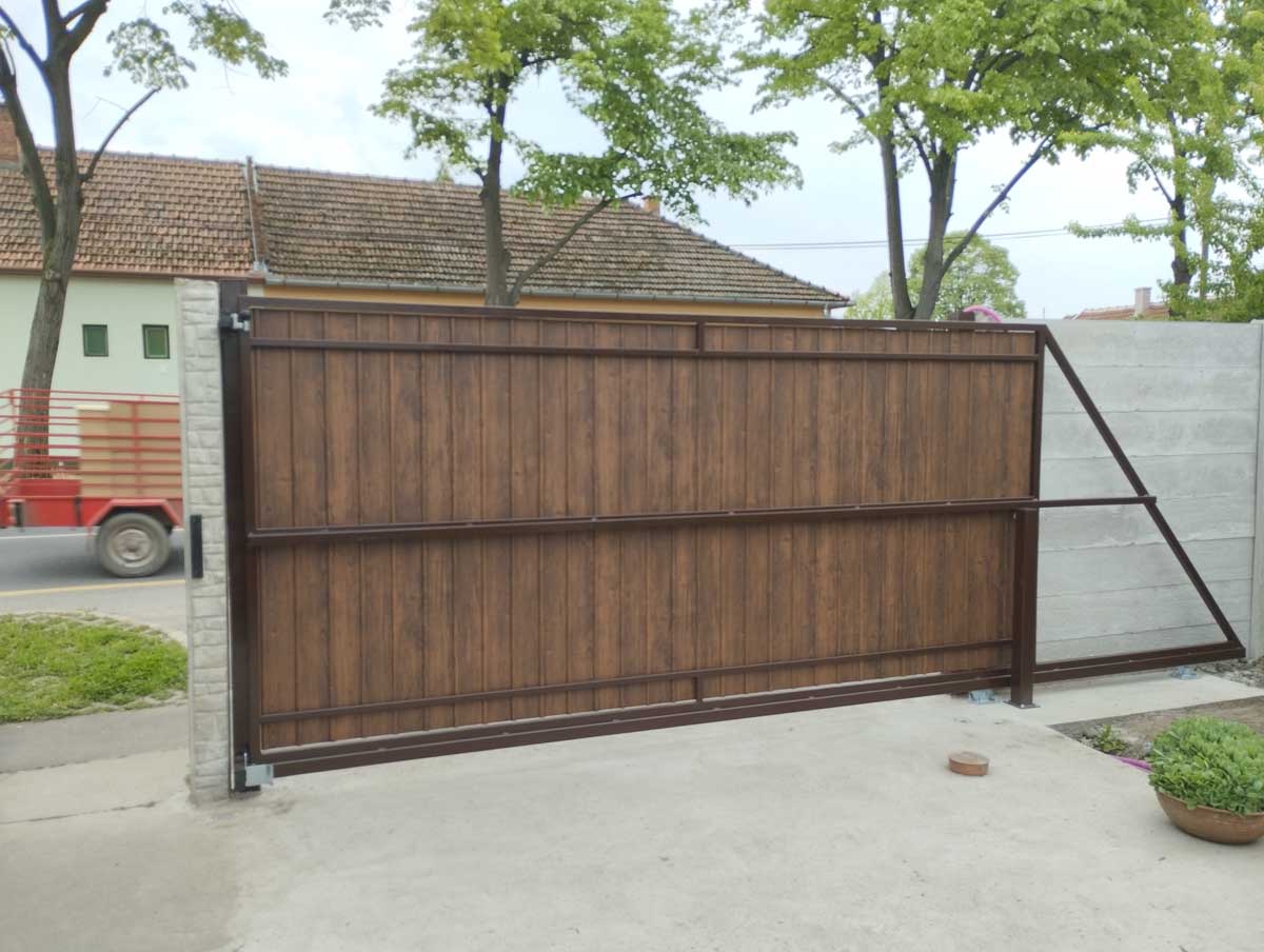 - Úszókapu diófa mintás T8-as trapéz lemezzel, keretbe ültetve