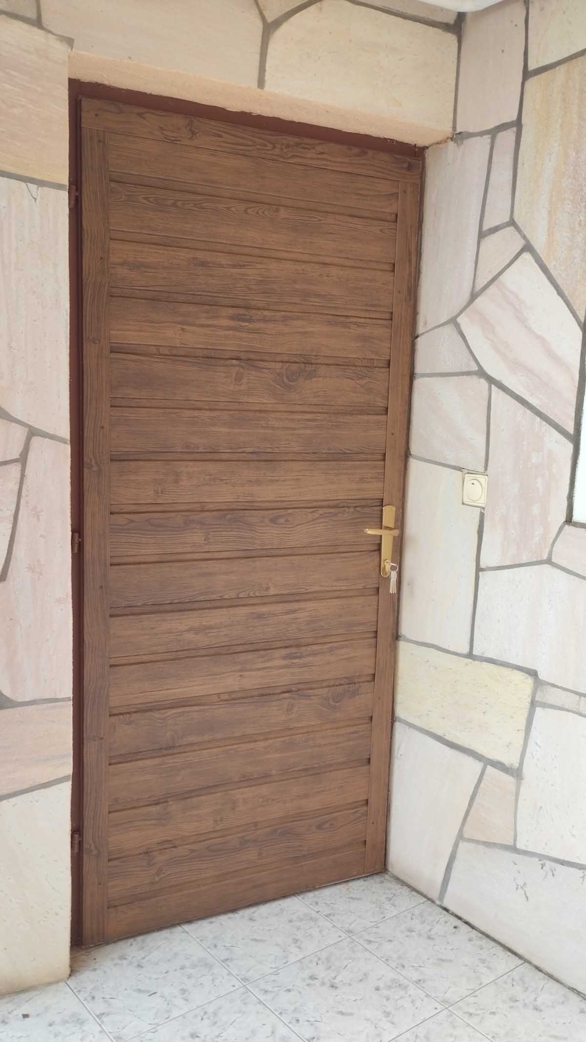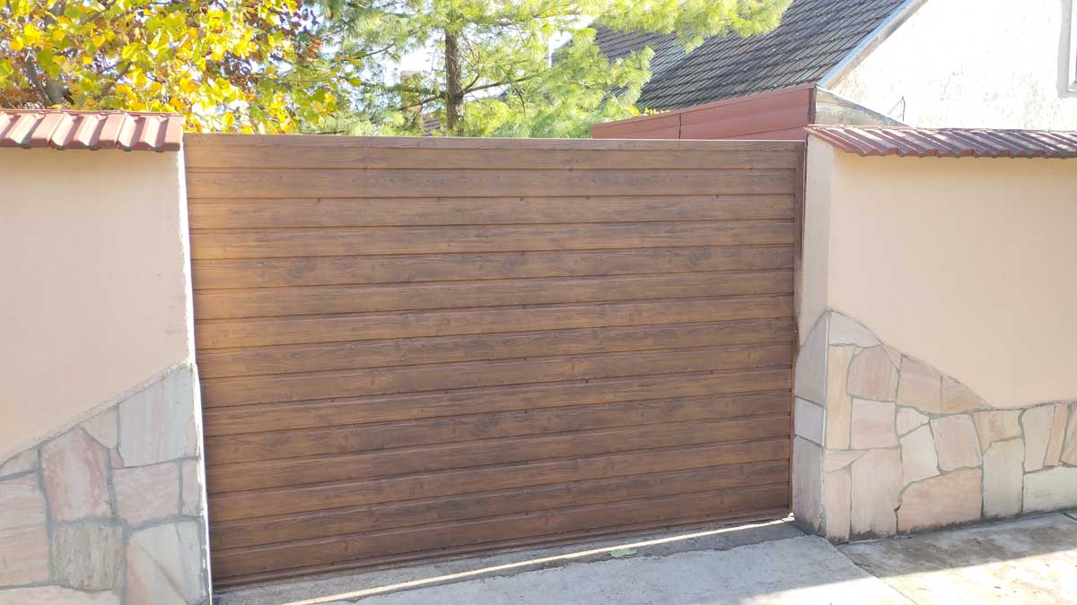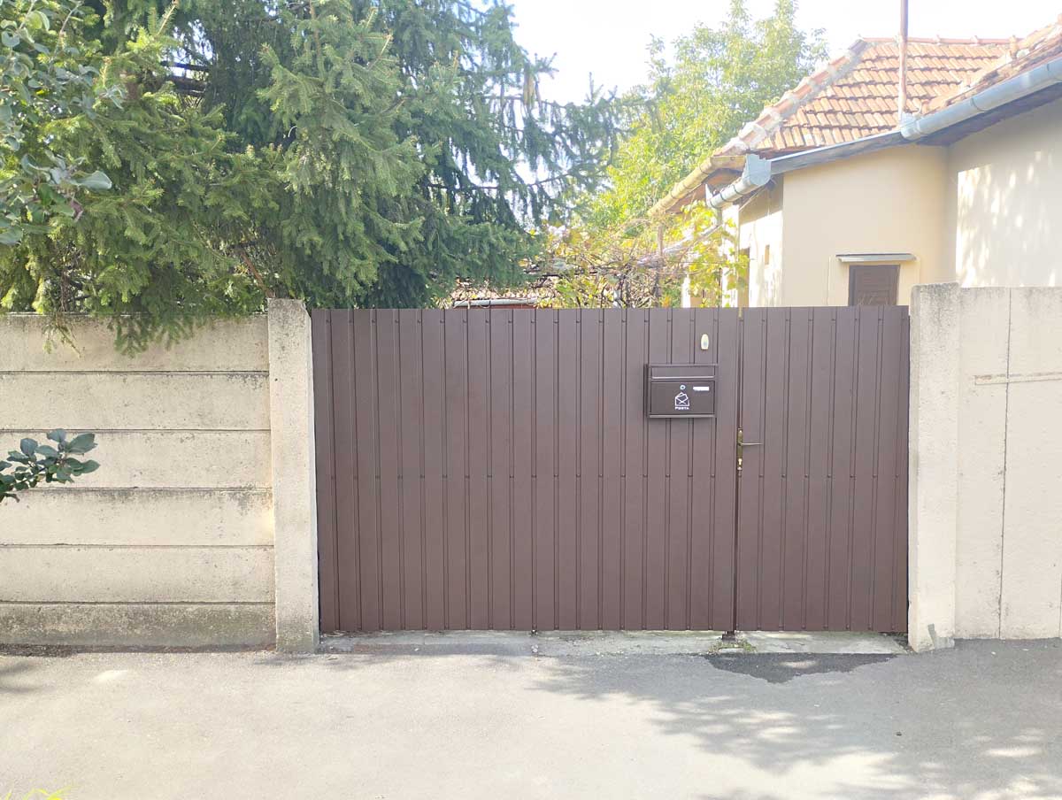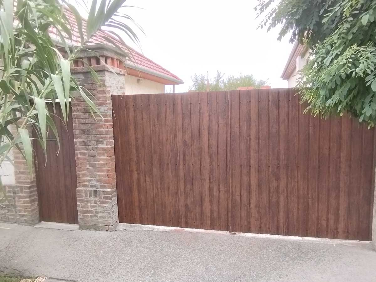 - Kétoldalas T8-as diófamintás trapézlemez fedéssel úszókapu, kiskapu gyártással. A lemez a kereten belül ültetve.