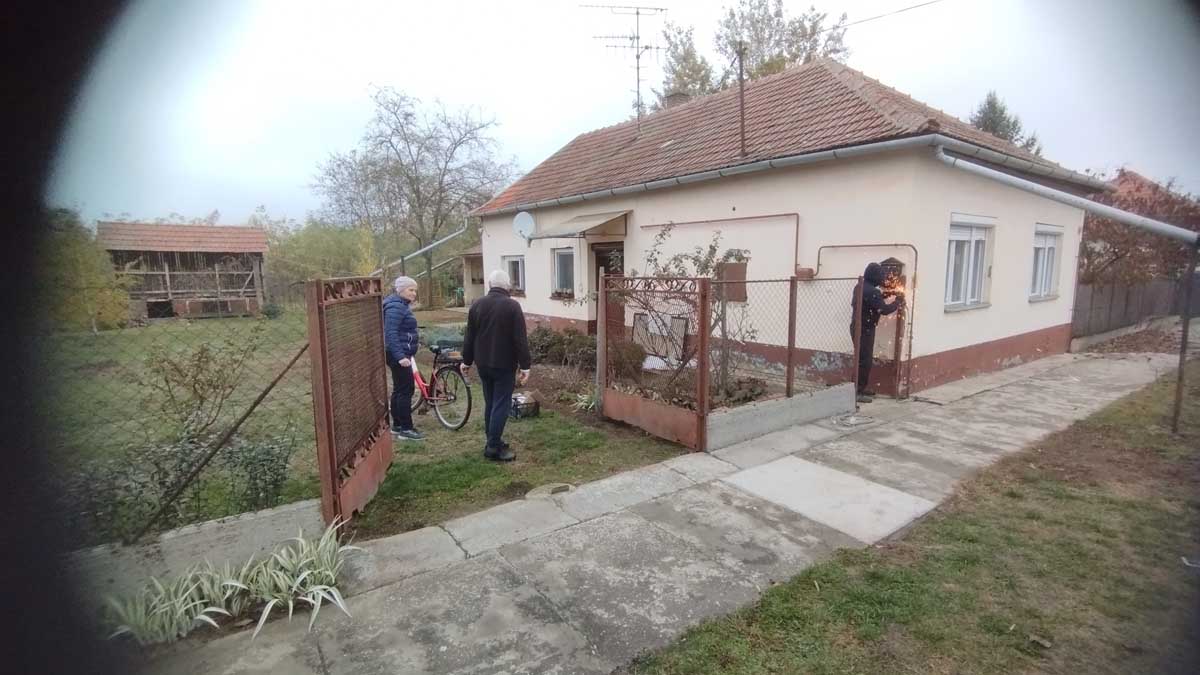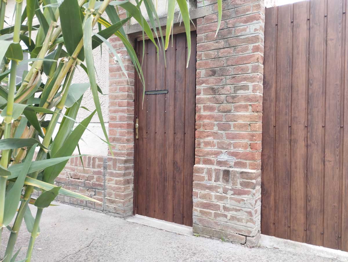 - T8-as diófamintás trapézlemez fedéssel a kétszárnyú kapuban egy kiskapu lett beépítve