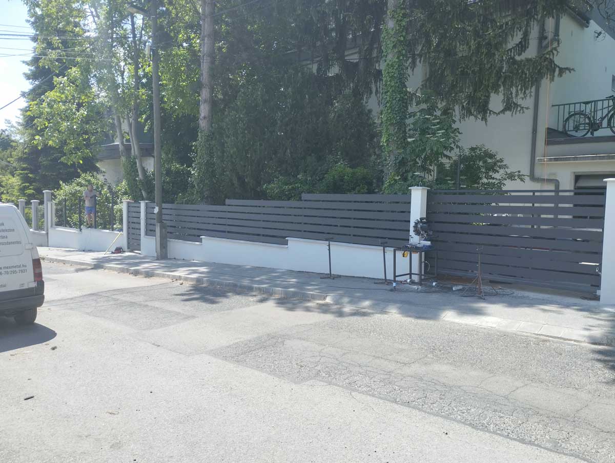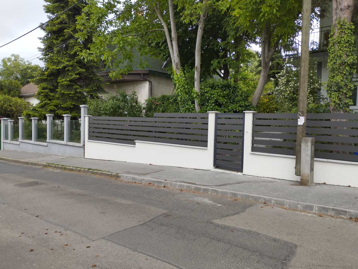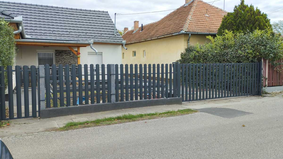 - Antracit színű íves kerítés lécekkel