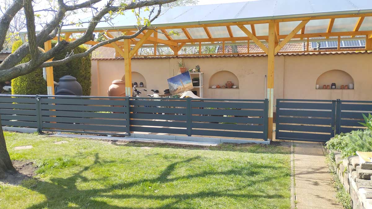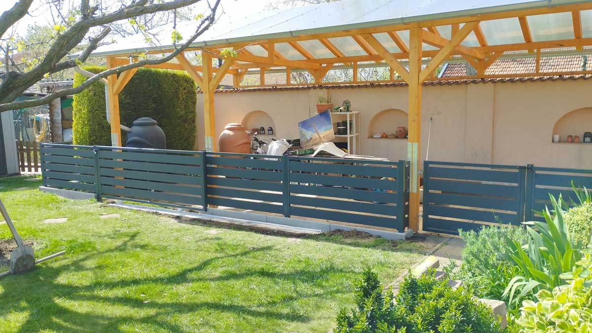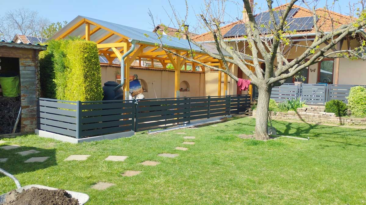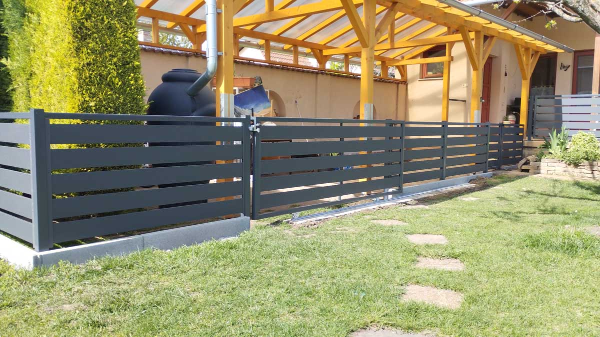 - Antracit színű íves kerítés lécekkel