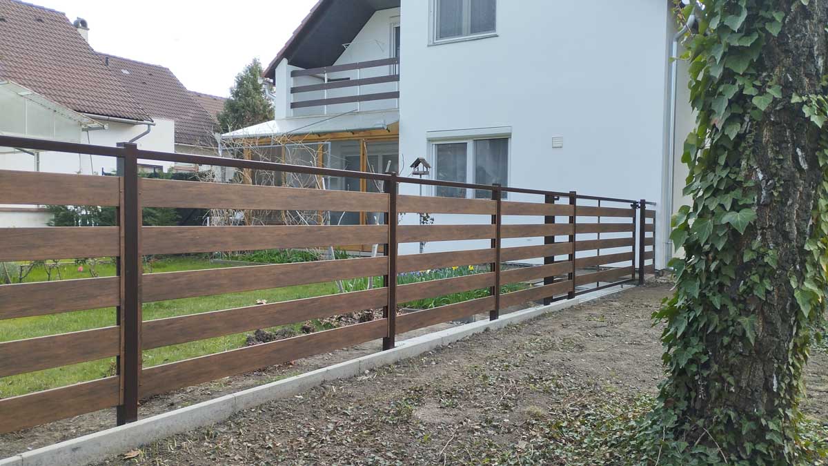 - Íves kerítés lécekkel diófa mintában